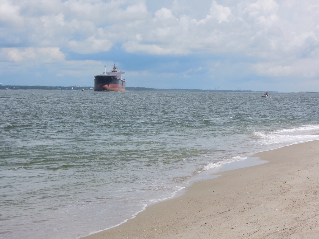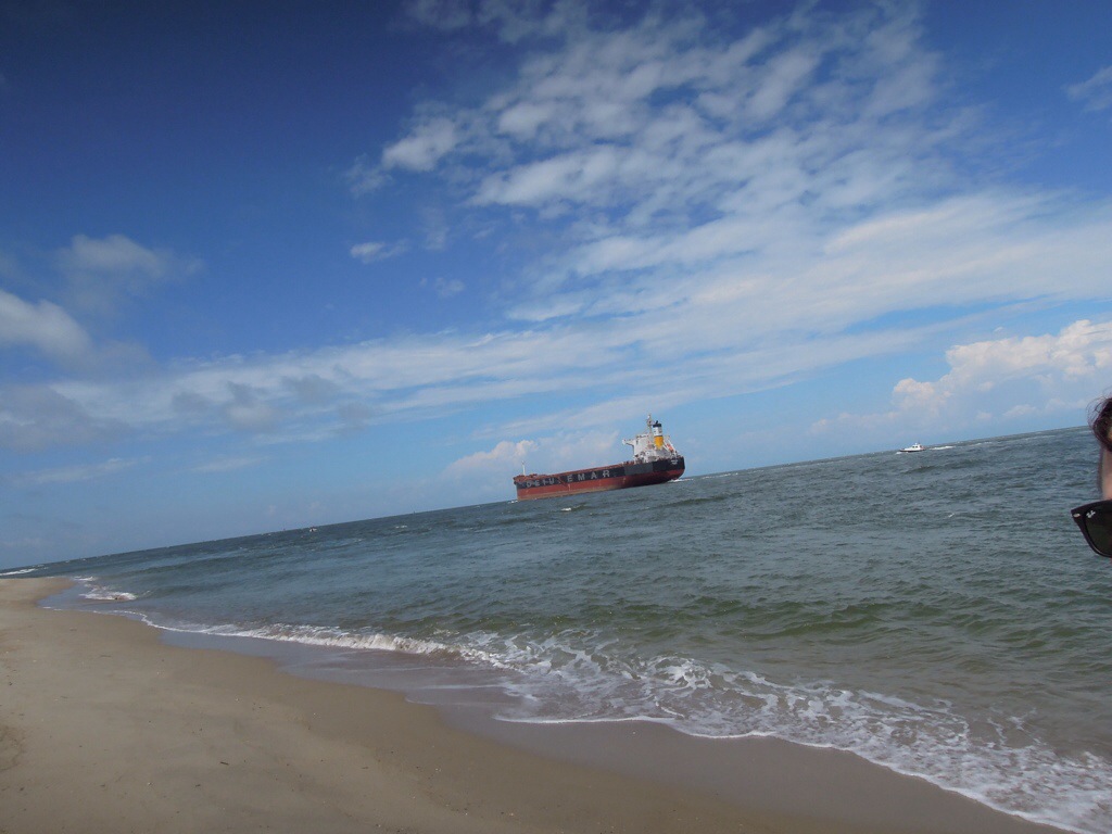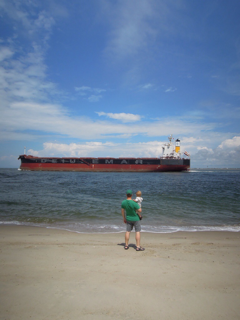 After exploring the remains of Ft. Holmes, we visited a tract of beach on the ocean side. We happened across a freighter who was going out to sea.
