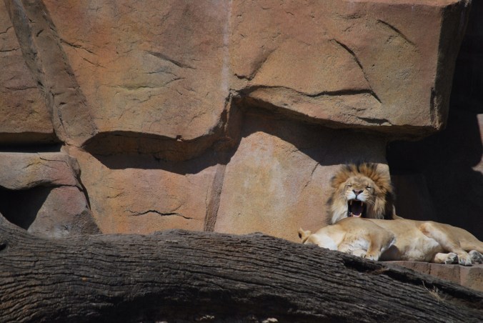 Nonetheless, we had moments of magic and wonder.  A polar bear put on a show–  splashing in his pool and playing with a ball.  The lions basked happily in the sunshine.  A gibbon and her baby performed acrobatics.