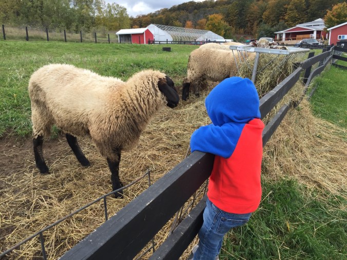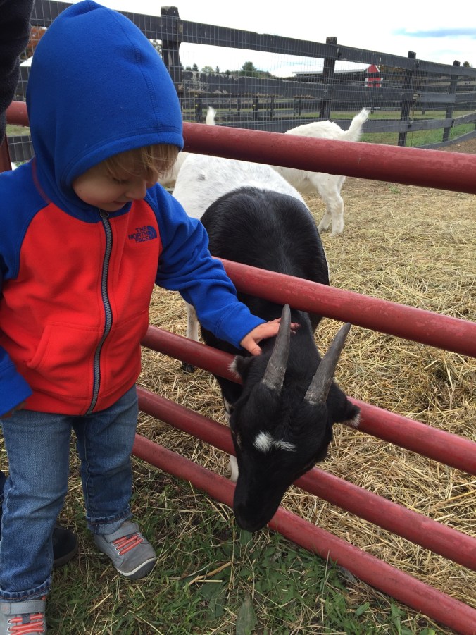 Round Three of our Leelanau ramble was a visit to Black Star Farms. Black Star is a Leelanau institution. They make solid wine and raclette cheese, and their grounds are beautiful. While wine tasting, we were delighted to discover that Black Star also has a petting zoo with rescued farm animals. Bambino loved meeting the goats, pigs, and sheep.