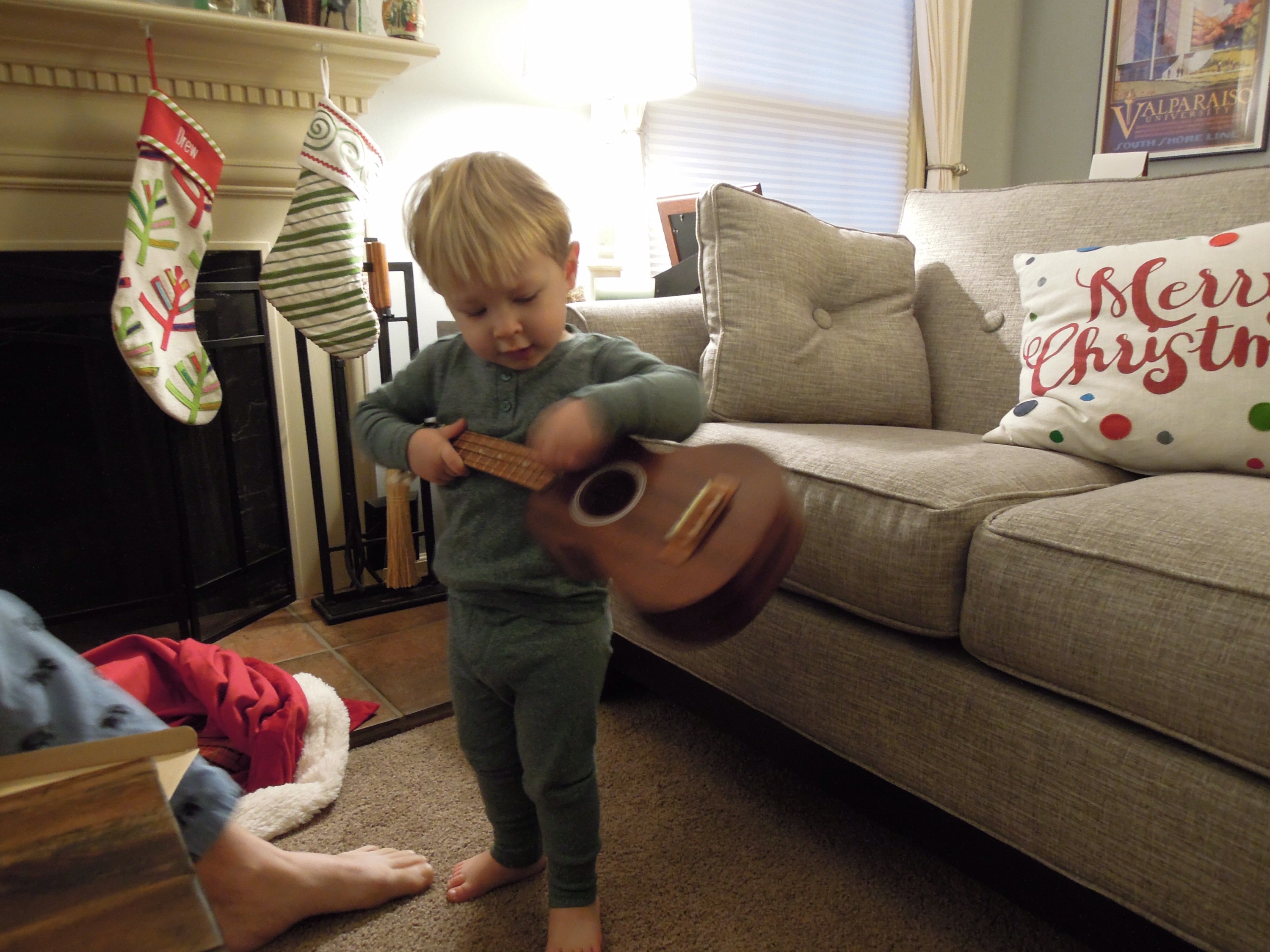 Christmas morning was filled with books, music, and shredded wrapping paper. Bambino received a ukelele from Santa this year. A microphone and drum pad also appeared under various trees. He officially considers himself a rock star.