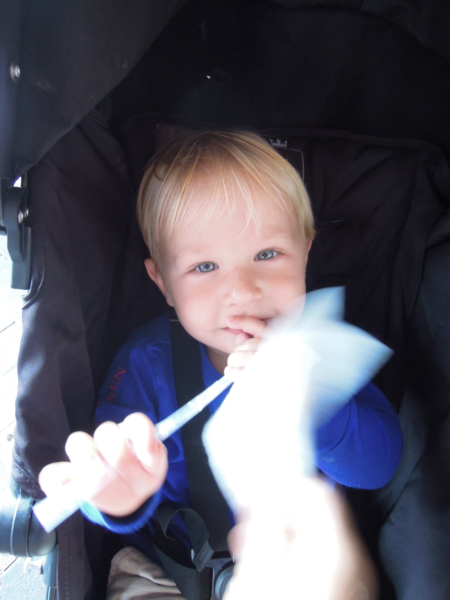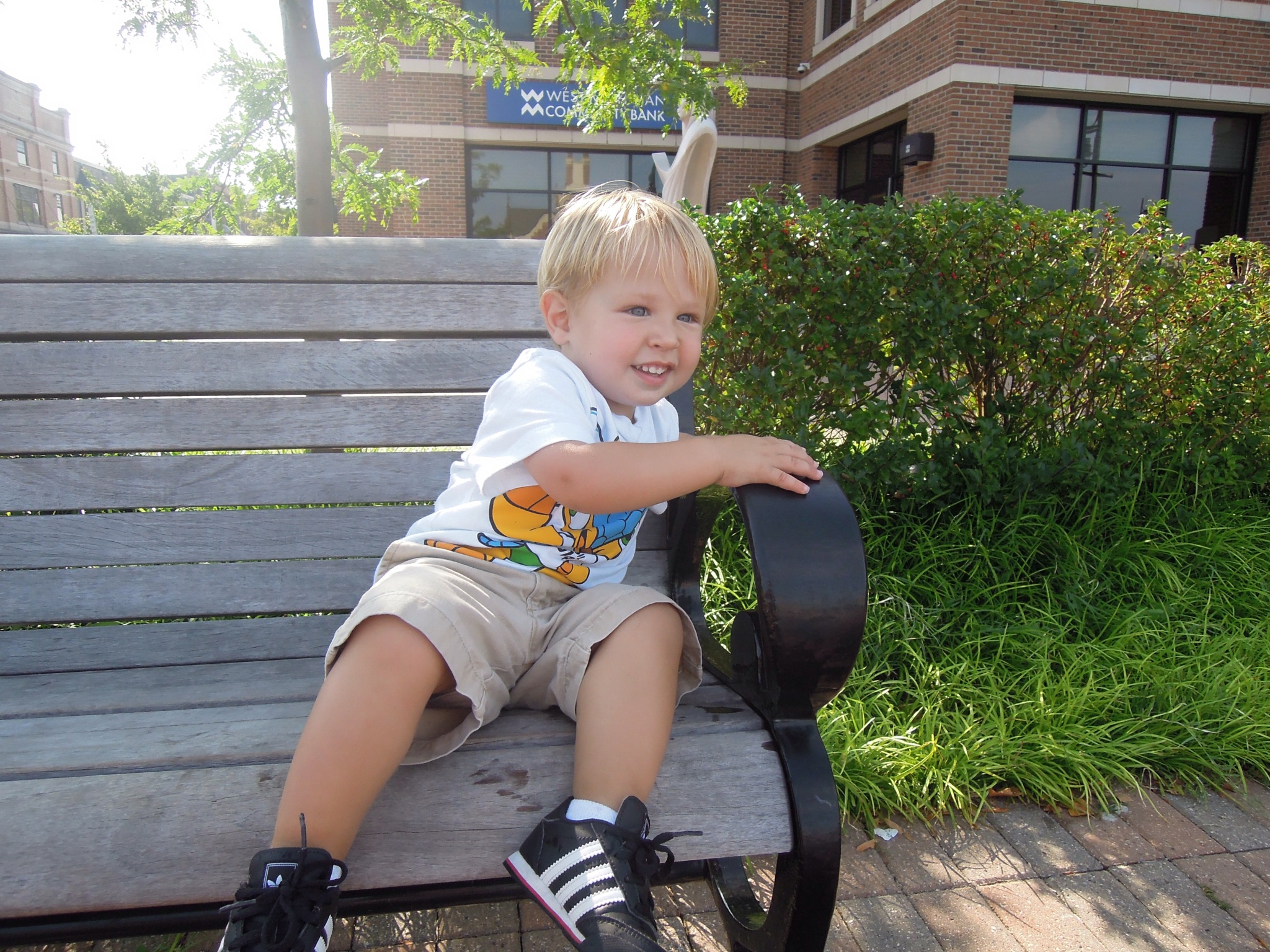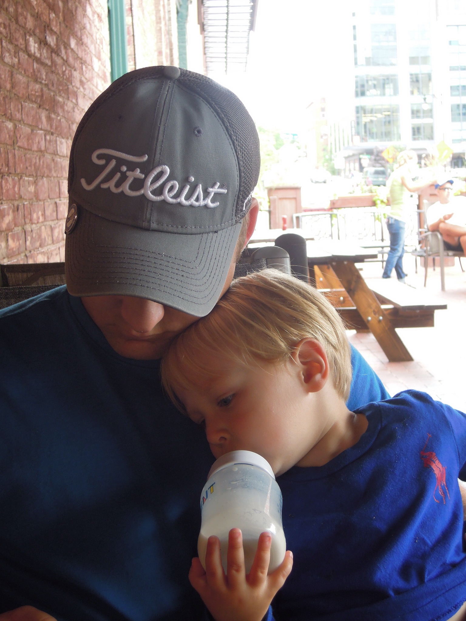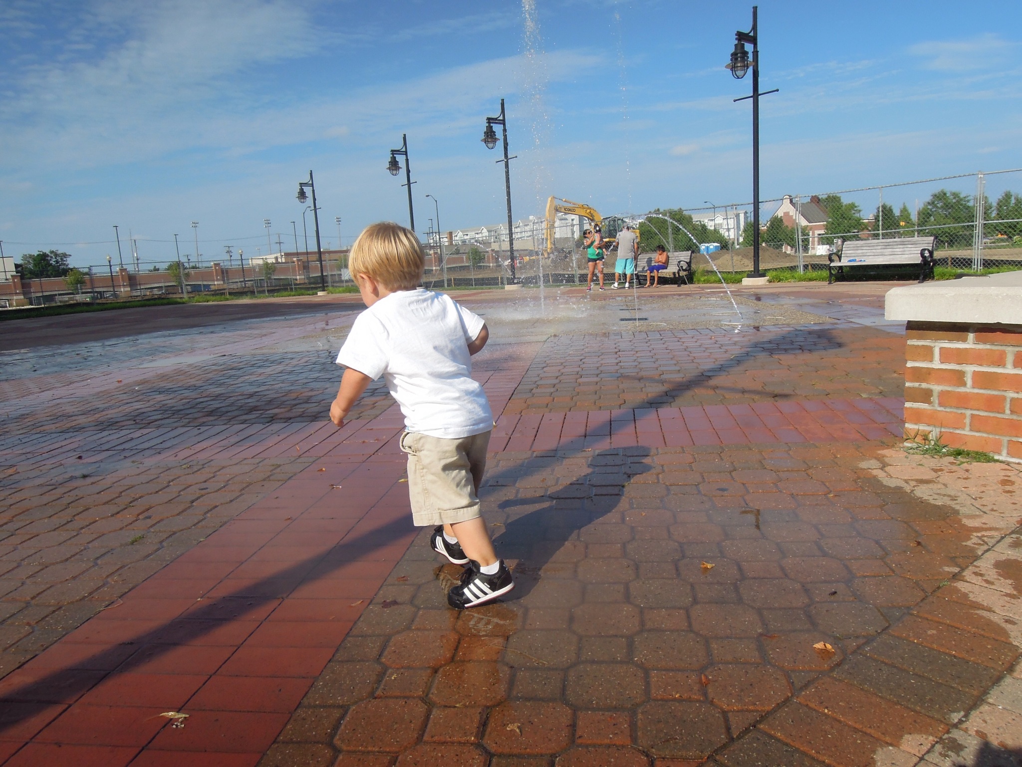 Daddy came home, happy and relaxed. With the sun shining, and nothing important on the agenda, lunch was dined al fresco. Then, Bambino discovered our downtown splash pad.