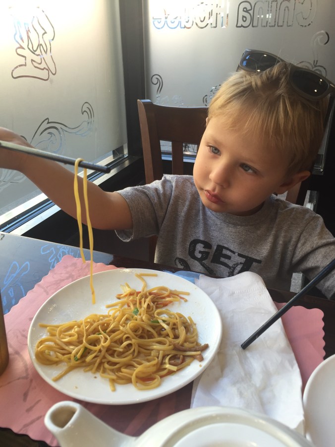 Bambino slurped noodles in Chinatown.